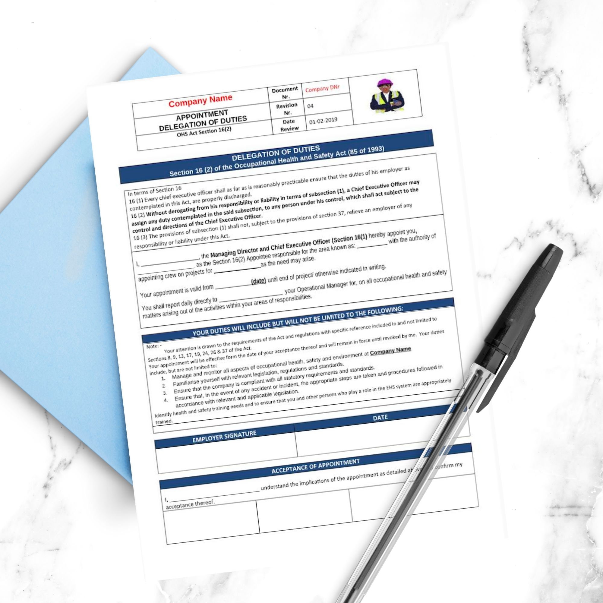 In the hierarchy of controls this letter forms part of the administrative control measures which should be in place to ensure that health and safety responsibilities are driven down through the business. This letter ensures that top management members are formally appointed to their health and safety duties and responsibilities in the workplace.