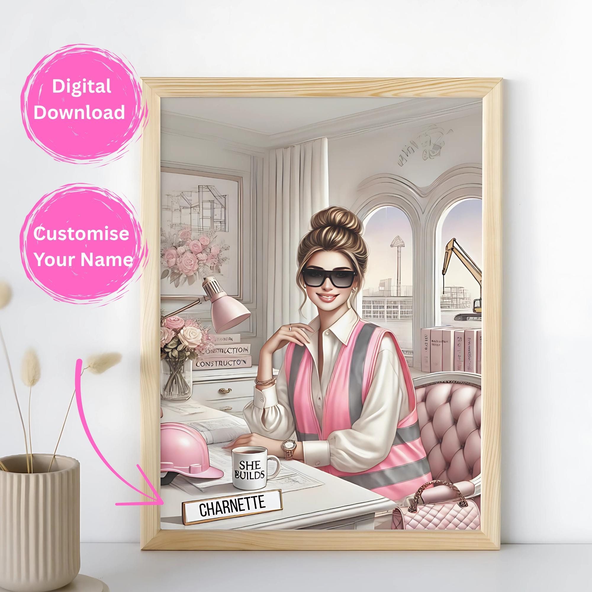 This stylish, high-resolution digital portrait features a confident woman in a pink reflective vest, seated in a beautifully decorated construction site office. Perfect for boss babes, safety officers, site managers, or women working in male-dominated industries — this artwork is a celebration of feminine power in construction!